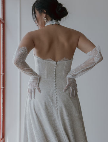 Elegant wedding gown with an A-line skirt and a beautiful Chantilly lace bustier. The fusion of delicate Chantilly lace and the graceful A-line silhouette creates a charming and timeless look, making your special day even more memorable.