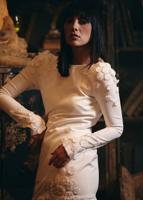 Our Eva gown is crafted from off-white bridal crepe with a tailored keyhole-style bodice and long sleeves. The voluminous balloon taffeta skirt adds a dramatic touch, while delicate 3D floral embroidery completes the look with romantic detail.