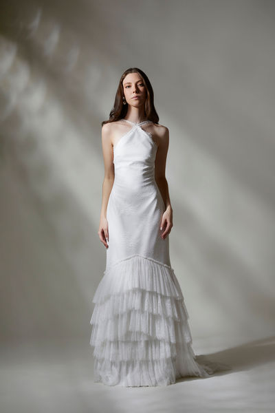 Meet the Lila wedding dress, a captivating halter-style gown with pleated Chantilly lace ruffles that fade from bottom to top along the skirt. The open back adds a touch of elegance and allure, creating a stunning silhouette for your special day.